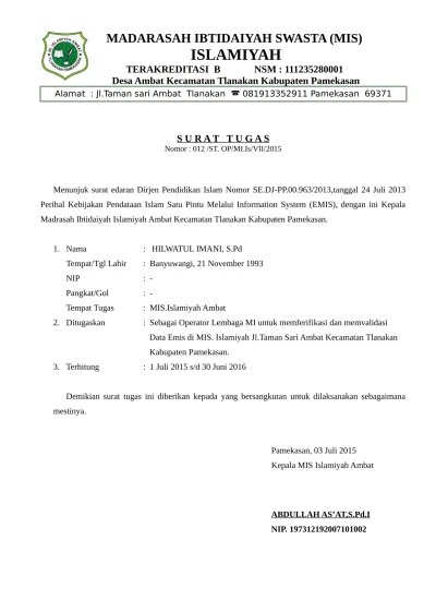 Contoh sk dan surat tugas operator emis lembaga tpq madrasah diniyah dan pondok .